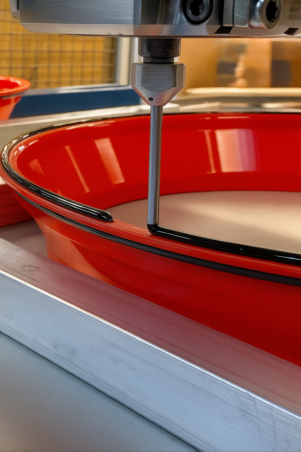 Il risultato è una guarnizione uniforme, precisa e ripetibile, anche su pezzi complessi o superfici tridimensionali, con tempi di ciclo ridotti e qualità costante.